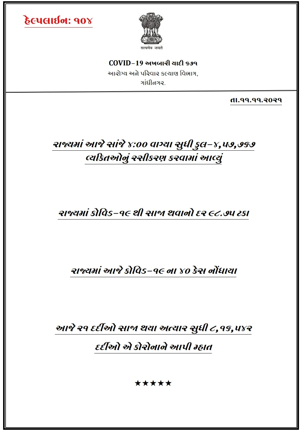 Covid updates 11 Nov and DIGITAL SERVICE: Citizens of Gujarat will get a copy of Birth & Death Certificates in a single day for only Rs. 10